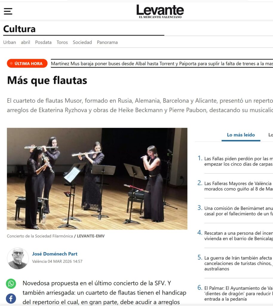Ein neuartiger Vorschlag beim letzten Konzert der Sociedad Filarmónica de Valencia (SFV) – und zugleich ein gewagter. Ein Flötenquartett hat nämlich das Handicap eines begrenzten Repertoires, das größtenteils auf Bearbeitungen originaler Werke zurückgreifen muss. Dieses „Geburtsmanko“ wurde jedoch von den Flötistinnen von Musor mühelos überwunden. Sie sind hervorragende Profimusikerinnen mit umfangreicher Erfahrung in Kammer- und Sinfonieorchestern, vor allem in Deutschland und Spanien.