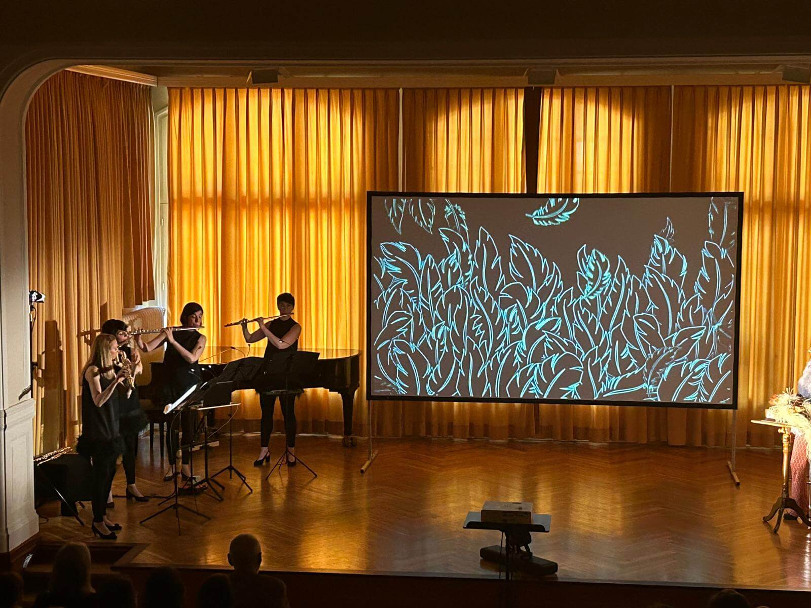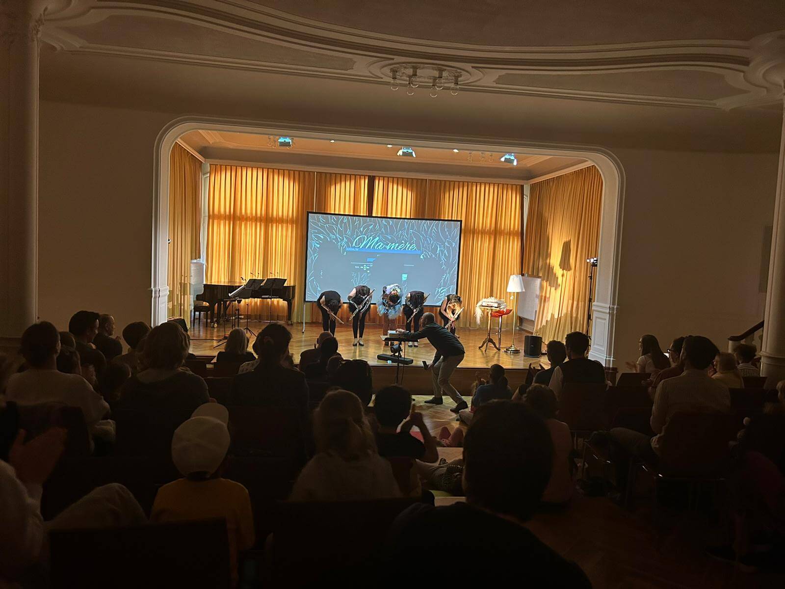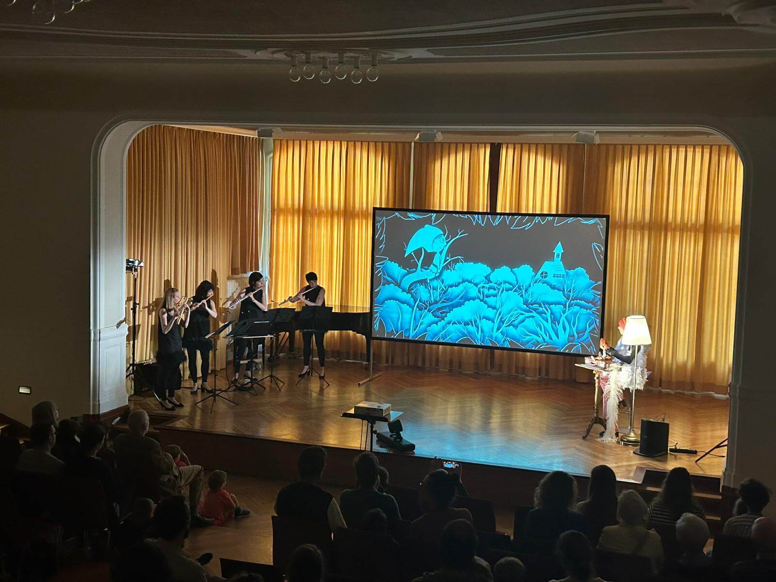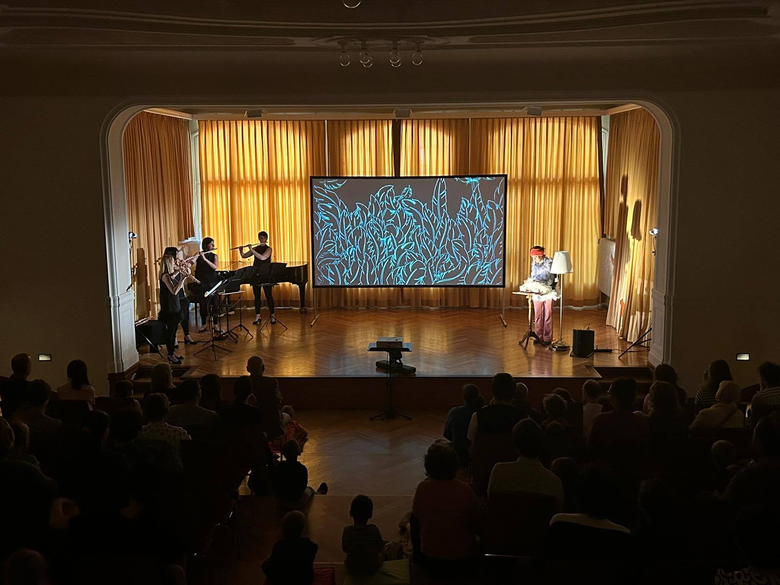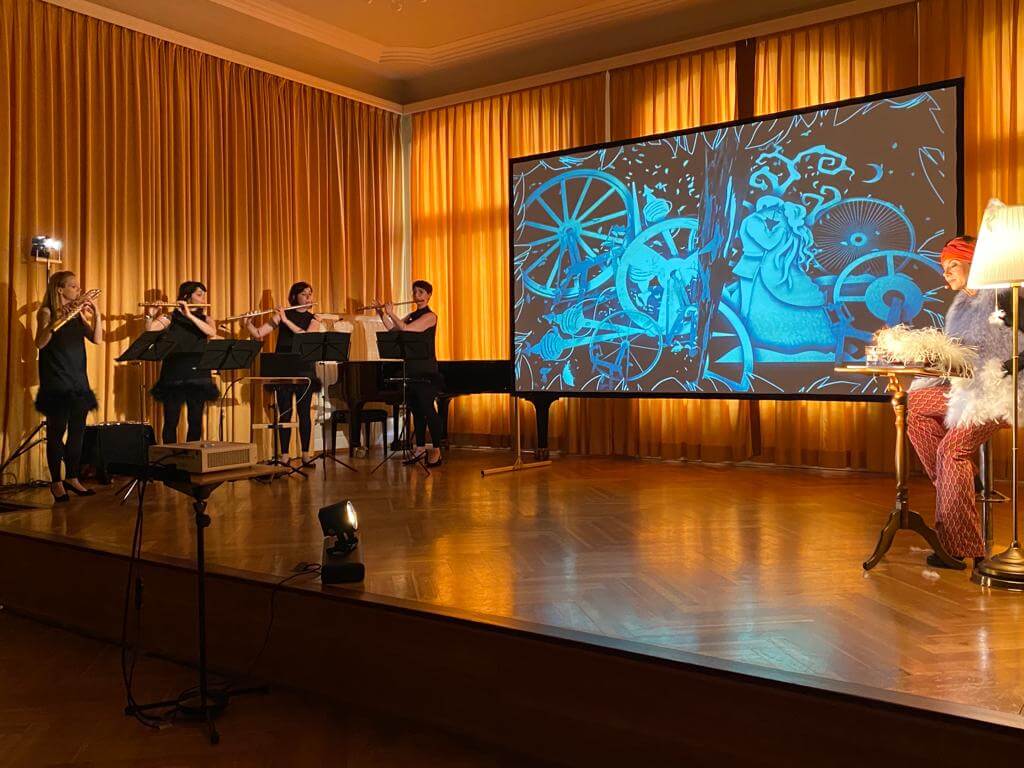 Kennt Ihr Mutter Gans oder Ma mère l’Oye, wie sie in Frankreich genannt wird? Sie ist die beste Geschichtenerzählerin, die ihr euch vorstellen könnt. Sie ist kuschelig warm und hat tolle Freunde wie den kleinen und mutigen Däumling. Weil er nicht gut einschlafen kann, erzählt Mutter Gans ihm spannende Geschichten und macht ihn neugierig auf eine Welt voller Zauber und Musik. Mit dem kleinen Däumling reisen wir musikalisch durch die Welt der Märchen, besuchen das schlafende Dornröschen, tanzen mit der Schönen und dem Biest – und finden uns schließlich im fernen Osten bei der geheimnisvollen Kaiserin im Zaubergarten ein. Mit Musik, Puppenspiel und Trickfilm verzaubert das Musor Flötenquartett und macht die Welt von Mutter Gans erlebbar. Die ursprünglich für ein Ballett komponierte Musik von Maurice Ravel wird in einem Arrangement für vier Querflöten gespielt. Dieses Projekt wird durch das Förderprogramm „Neustart-Kultur“ des Deutschen Musikrats und die Beauftragten der Bundesregierung für Kultur und Medien unterstützt.