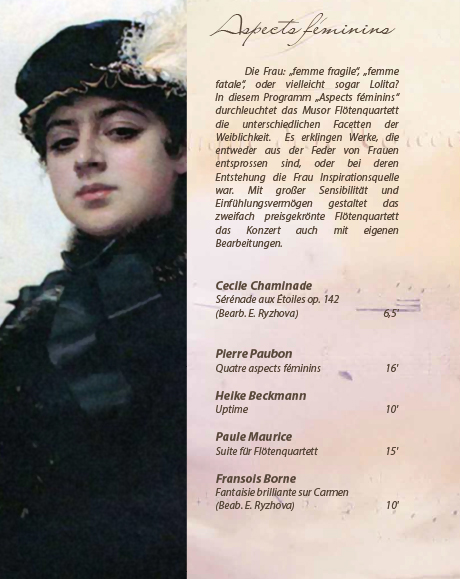 Die Frau: „femme fragile“, „femme fatale“, oder vielleicht sogar Lolita? In diesem Programm „Aspects féminins“ durchleuchtet das Musor Flötenquartett die unterschiedlichen Facetten der Weiblichkeit. Es erklingen Werke, die entweder aus der Feder von Frauen entsprossen sind, oder bei deren Entstehung die Frau Inspirationsquelle war. Mit großer Sensibilität und Einfühlungsvermögen gestaltet das zweifach preisgekrönte Flötenquartett das Konzert auch mit eigenen Bearbeitungen..