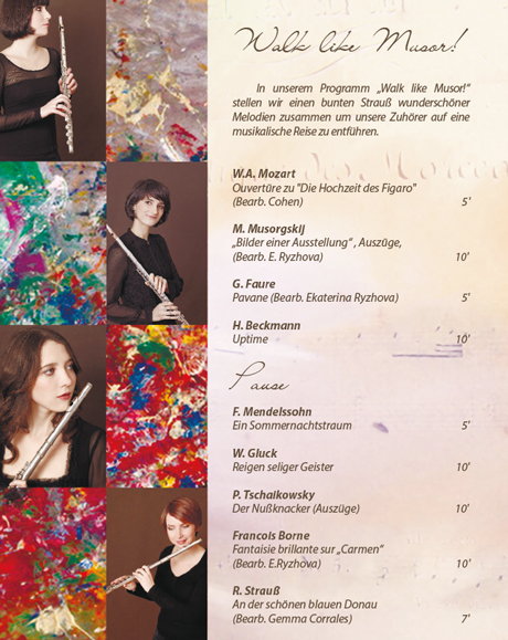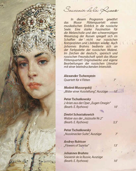 In diesem Programm gewährt das Musor Flötenquartett einen musikalischen Einblick in die russische Seele. Eine starke Faszination für die Melancholie und den schwermütigen Wesenszug der Russen spiegelt sich im Schaffen der nicht nur russischen Komponisten und Literaten wieder. Auch Johannes Brahms bediente sich an der Farbpalette der russischen Malerei. Im Zeichen der deutsch-, spanisch und russischen Freundschaft spielt das Musor Flötenquartett Originalwerke und eigene Bearbeitungen der russischen Literatur mit einer beeindruckenden Intensität.
